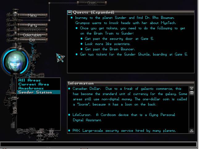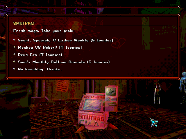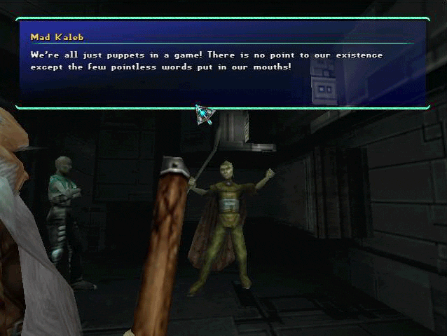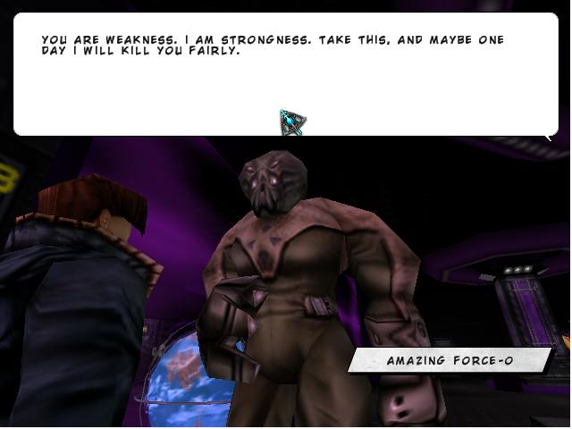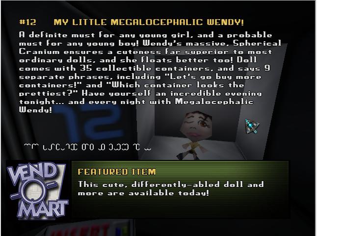 Too bad he didn't find the Orkin-type MysTech | Beware, precious yen... BEWARE! | He looks more like Cthulu than a Klingon... | Look out Barbie, here comes MEGALOCEPHALIC WENDY! | If you could just hit that building saying "Eidos Interactive" that'd be perfect... | It sure is... | Well, at least they can ADMIT when collecting a type of item is totally arbitrary *cough*Soul Reaver*cough* | *crosses fingers* PLEASE be saying this to the entire fucking Eidos executive board... Some of the names of these pornos are rather interesting... MONKEY! VERSUS! ROBOT! |