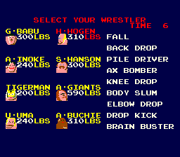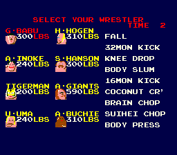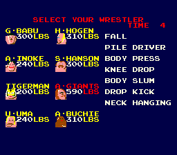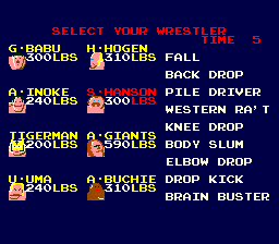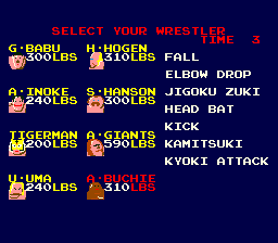 G. "Herr Fuhrer" Babu, will put you in a serious Body Slum if you challenge him | A. "The Giant Mound Of Turd" Buchie has a lethal Head Bat that subdues even the strongest wrestlers | Opponents of A. "Copyright Infringer" Giants won't be opponents for long after a good Neck Hanging | S. Hanson not only has a powerful Body Slum, but can also get you with a Western Ra'T, whatever that is. | Last, but certainly not least, everyone had best beware of "Beverly Hills" H. Hogen |