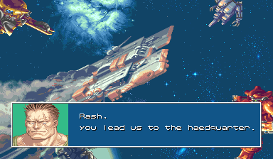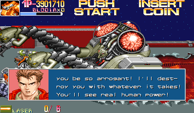 OK, nothing wrong here right... | But now, at the beginning of the FIRST LEVEL, Justice's name is immediately misspelled... Blast! HAW HAW GET IT?! | I guess a haedquarter is probably some kind of olde english Beowulf kind of thing | Boss hit? Sounds like some kind of fifties slang But not as much damage as the years of public education have done to your grammar skills | Well, at least it's not the whole "WHY DO WE FIGHT BLAH BLAH BLAH OH GOD THE DICKS" kind of speech like in Gundam Wing | Really, I don't think 'Human Power' can match 'Big Fucking Tentacled Alien With Death Lasers Power' |