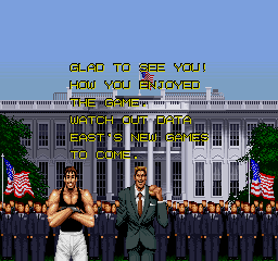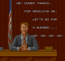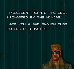 OK, Ronnie is one of three things: 1) A really fruity name for a President of the United States, 2) A bad attempt to make fun of Ronald Reagan, or 3) (see #2, replace "Reagan" with "McDonald"). | "I like DECO game!" (DECO=Data East Corporation)...and it's for sale! | Yeah, I heard about that. In the eighties, ninja crime was the biggest problem in the inner cities. | Nam-WHAT? | Reagan really was a senile old bastard | The Macross guy strikes again! If any of DECO's other games are as bad as this is, you'd better watch out... |