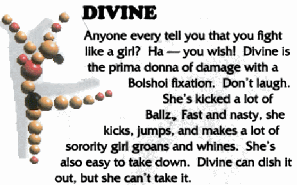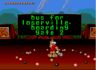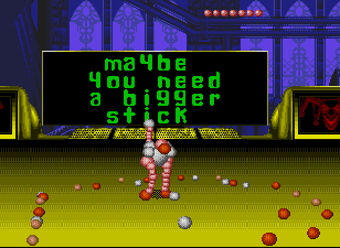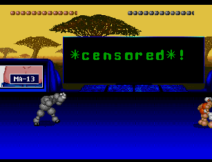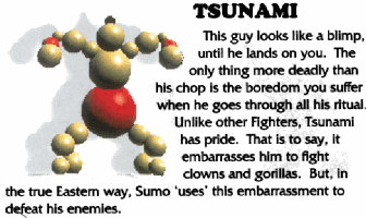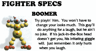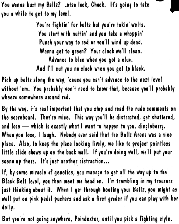 "Sorry, you'll have to wait for the next scheduled run... This game's developers have filled up this one..." | $%*&^@$ | What the hell is that supposed to even mean? And scans from the manual: Well, then it's a good thing this game isn't making me laugh... | I think she's supposed to be the game's sexy fighter, but she just looks like everyone else, except in a different color... | The instruction manual's intro, complete with one of those really shitty raps that everything had in the early 90's... | If I were him, I'd be embarassed to even be in this game... |