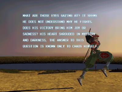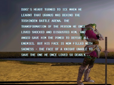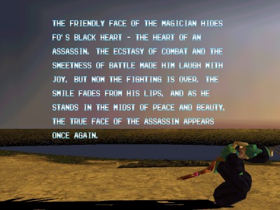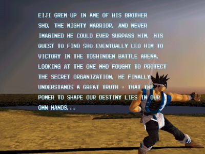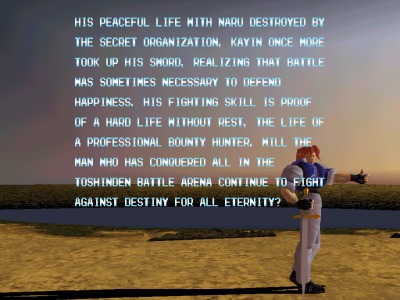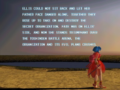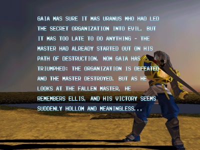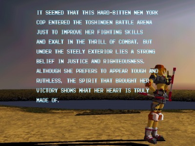 ...So only he knows if he's happy or sad? Cause I'm guessing he's the only one who could give a rat's ass about it | Good to see them working on the story plot | SAD ENDING! That is it would be, had this game had any well designed or memorable characters... | Couldn't it be simplified by saying "With great power comes great responsibility?" | Let us celebrate the destruction of "The Secret Organization!" | Are these supposed to be real amazing and deep endings? Because I've heard more prose and meaning in Vanilla Ice's "Go Ninja Go" | What a hollow and meaningless ending... How appropriate, as that's the feeling of anyone who plays the game | The game makes what? | Since there's a Toshinden 3, I guess I have to sadly say "TO BE CONTINUED" | HE CONTINUES FIGHTING, KEEPING ANGER IN HIS HEART! | You'd think a secret organization THIS powerful would've found the time to make a name better than "The Secret Organization" | But with her appearing to be a S&M dominatrix, wouldn't she LIKE the pain? Or is she not a fan of the pain, like the dominatrix girl in Runaway City? | So she finally won... IN THE NAME OF THE JUSTICE!