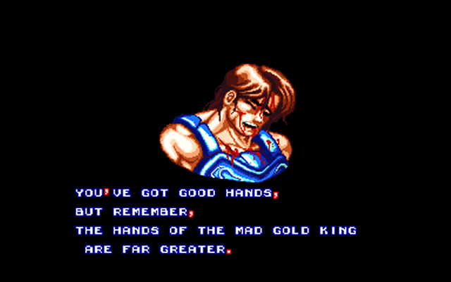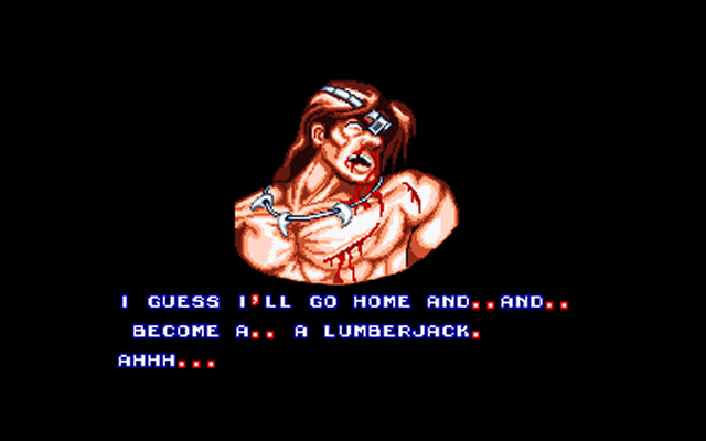 He's a lumberjack and he's okay. That's... a strange way of measuring someone's worth. NOT IT'S NOT POSSIBLE FOR ME TO LOSE!! They must use heads as currency over there. It's really hard to take a last boss seriously when they talk like this. |