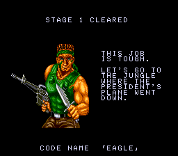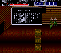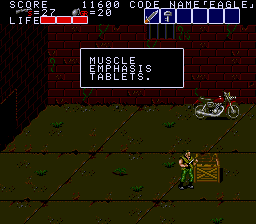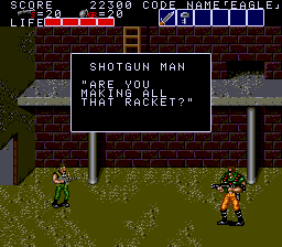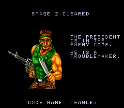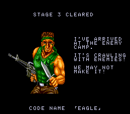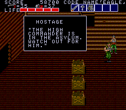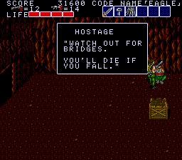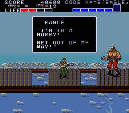 Thanks for narrowing it down, buddy! "Watch out for bridges. You'll die if you fall." Eagle arrives at the "enemy camp". The leader of the baddies is crazy, I tell you! Yeah! That'll get 'im the hell out of your way! It's Bad Dudes all over again! |