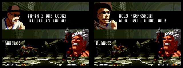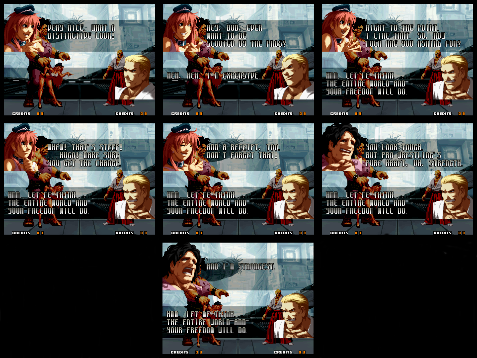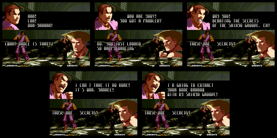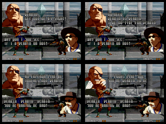 Sagat: At the match's climax, Sagat whispers into Choi's ear, "Vermin." Choi's sudden fit of insanity leaves him open and he gets the last few ticks knocked of his health meter by a tiger uppercut |