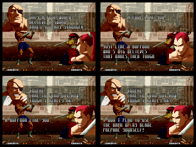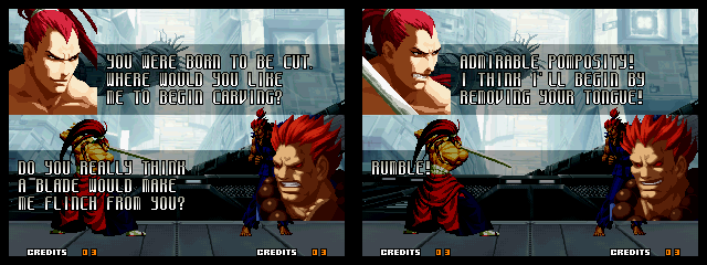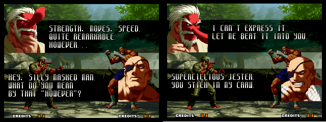 Eloquence flows from Sagat's vocal cords: "Supercillious jester. You stick in my craw." |