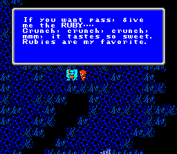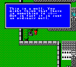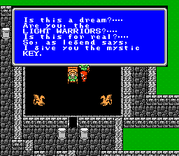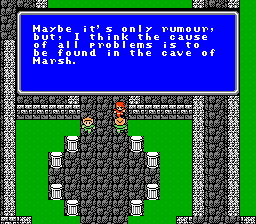 "See your face upon the clean water! How dirty! Come! Wash your face!" | Herb? Matoya's been toking the fat daddies | It can be used as herbal medicine, if ya know what I mean | The elf prince f'ed himself right up | Pravokians are quite familiar with the mystic weed. | Oh no! He's sleeping! *gasp* | ALL problems. No exceptions. | What a witty name! | A quote to inspire you. | Stars AND Prophecy? Woah, usually it's just one or the other. These are some kickass sages! | Nah, a little Windex'll produce the same effect | Repeatedly? | No, really? | No, really? | Remember this, it's the single most important clue in FF1 | Investigating what? | "Everybody knows me. What? You've never heard of Dr. Unne?" | Yummy. | Huh huh. Rod. | Oh look, video game action hero self dialogue! | HEL2: A magic to recover HP for all of you." | It's just a well.