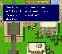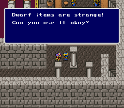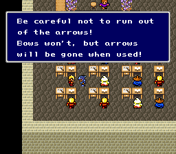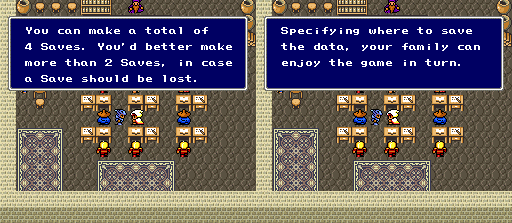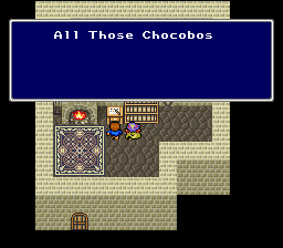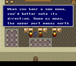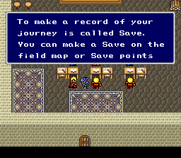 Yeah! The training room! This gives you so many hints on how to play the game you'll want to puke! And all of them have horrible translations! Here ya go: Articulate advice on saving | Very helpful tip on how to use the world map! | Final Fantasy II: Fun for the whole damn family! | Yeeeahhhh, real sure I could run out of bows