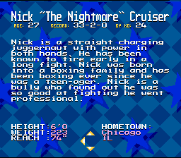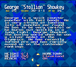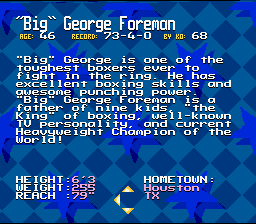Methinks the game designers have their mouths firmly planted on "Big" George's phallus | Yes, from the sounds of this bio, it looks like they hired a washout boxer who had taken a few too many blows to the head to write the textual portion of the game. Could it be... Foreman?! | I'm guessing he got his nickname in the bedroom | Is there a paragraph in the house?!? |