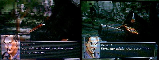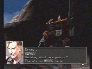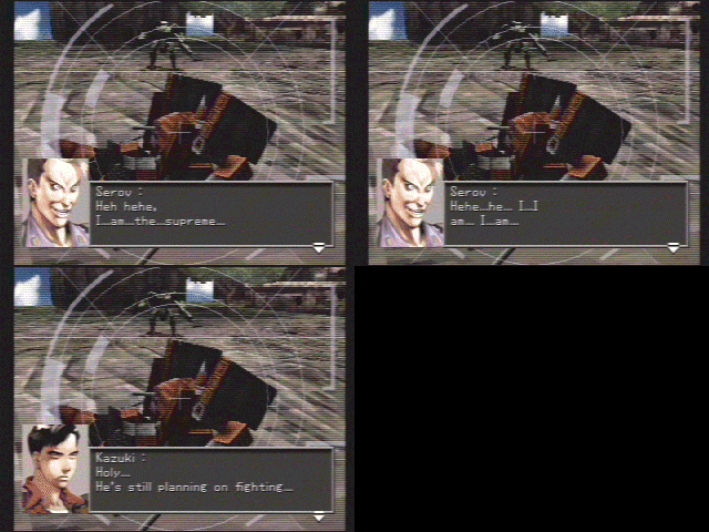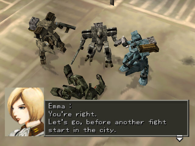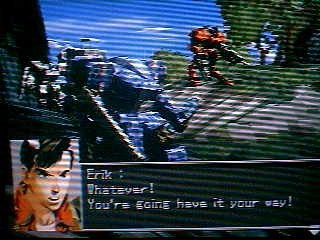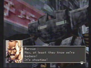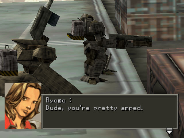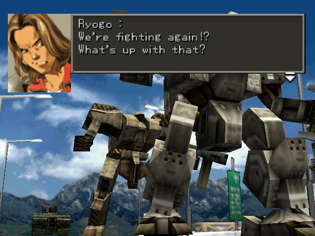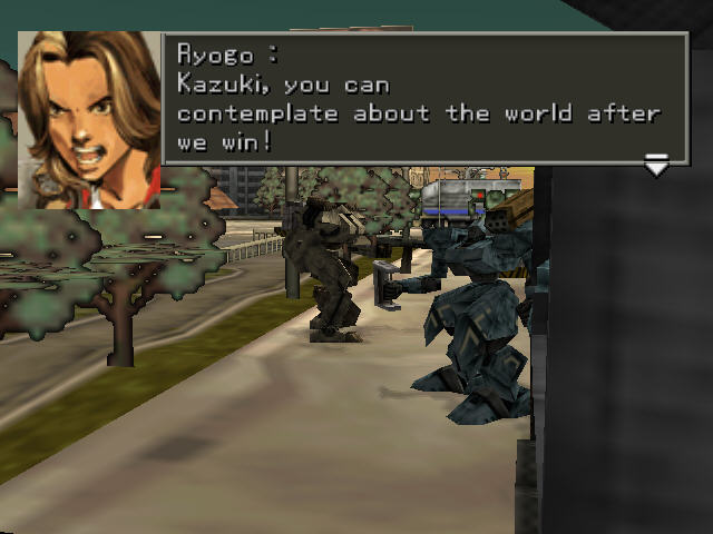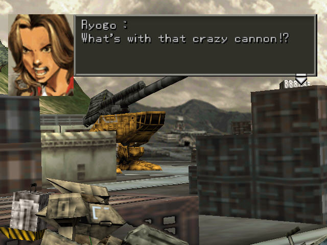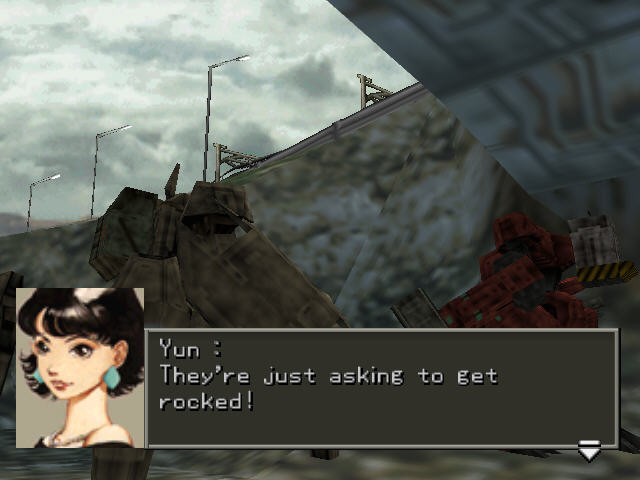 I knew I shouldn't have installed that power jack in the back of my skull... | YOU KNOW WHAT YOU DO- *SYNTH CRUSH DEATH* | That's right, you're just going to LEAVE him behind and run | You're both fucking pansies | It's a cannon, and it's crazy. Pretty straight-forward... | Yeah... HE THREW MUD IN THEIR EYES! | It's George Clinton's WANZER OF FUNK! HE'S GONNA DROP DA BOMB ON THIS MUTHA! | So maybe you should stop | Wow, two broken sentences in the same text box! | He's MAD, I TELL YOU! MAD! | WE WILL, WE WILL ROCK YOU! | Wow... How could a group of people using gigantic robot suits to fight against a gigantic international conspiracy gain stress?