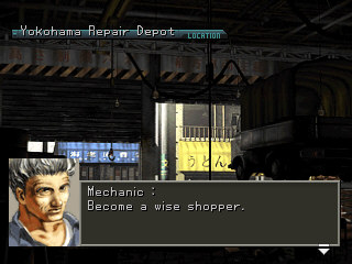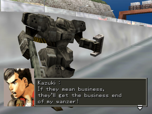 Is that the shooting end, or the punching end? | You haven't seen Yellow Submarine, have you? | The cockpit of a wanzer isn't the best place to make LiveJournal entries, Kazuki | Sounds like fun. Where did they go? | Or else I'll punch you in the throat. | Ooh! Feisty! | I also would have accepted the word "festive" | You know what I don't like about murderers? Instead of coming in, ordering a meal, and paying for it afterwards like your average customer, they kill everyone and steal all the money. That's why I put up the "NO MURDERERS" sign on the door. | Sure! Just give me some chewing gum, a screwdriver, a magnet, and a machine gun! | Like, get a room, guys! | Easier said than done | Maybe they thought you were a woman | Kazuki, did you forget to flush again? | Well, I had some money a few minutes ago, but those damn censors stole it | And why are they called wanzers, anyway? I mean, why not just call them walking tanks? And another thing...