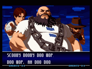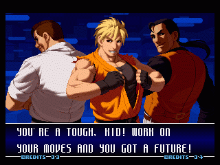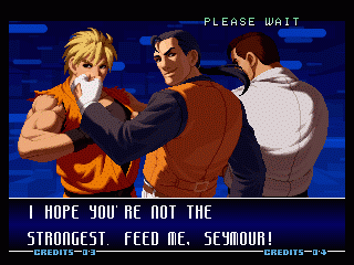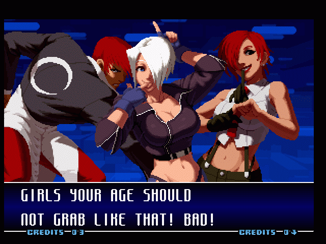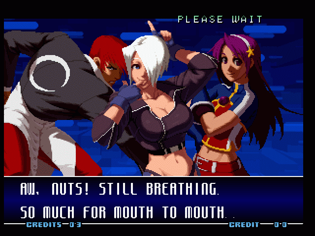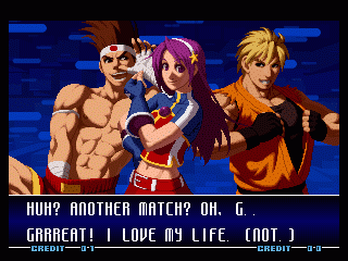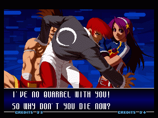 KOF for grown-ups, now with 200% more suicidal ideation | Jerk | I don't get it, am I a "tough" or just a tough kid? | Hawt | Hmm, actually, this is getting kind of creepy. I'd expect she'd try to suck out my soul | Something is being implied here and, you know, I just don't really care | Iori making no sense | It's the scatman, and he is extremely large | It's like after eight KOF games, they start running out of things to say and just start making shit up |