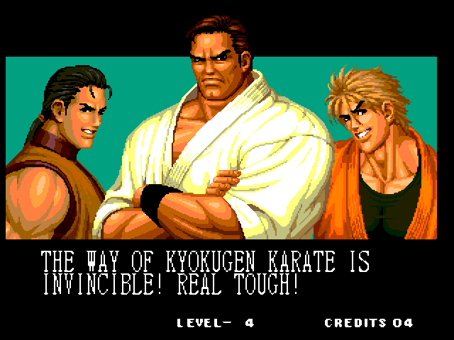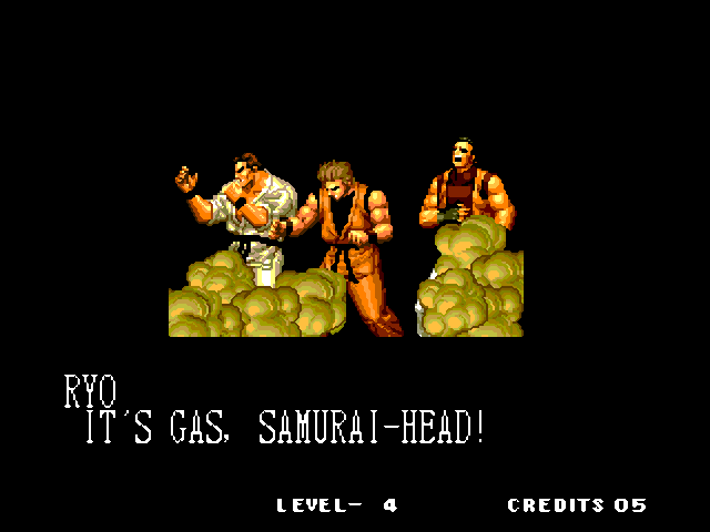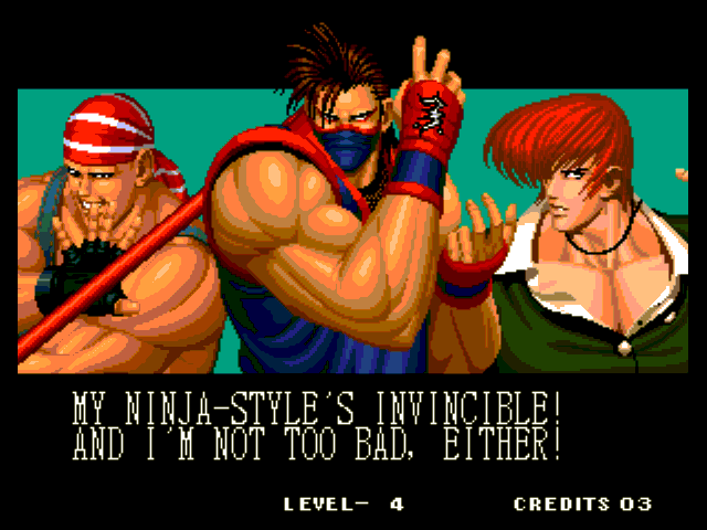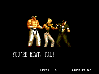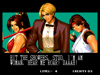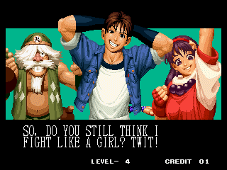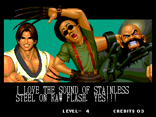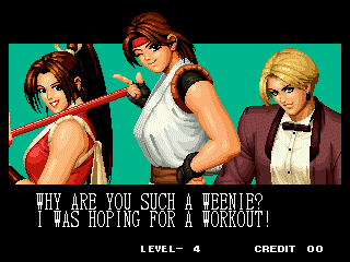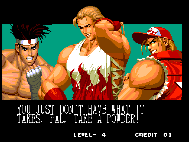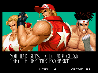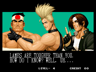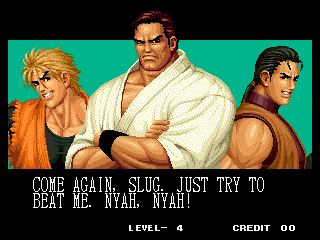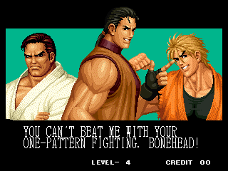 THOU SHALT NOT MESS WITH THE DUDLEYS! | I think Bionic Commando said it best with, "EAT THIS, YOU SCUM!" | Uh, I thought Iori was self employed... | Something about "flail away" just sounds so girly... | Increasing your word power, with Takuma Sakazaki | Sounds like the Crime City intro... | Actually, that's not an insult, that's basic biology... | Well, ripping off Strider's look has to give you SOME special abilities... | Andy, just say NO! | That's more of a retarded scream than a roar | Wow, a rather flaccid SNK insult I haven't heard before... | That sound, that grating sound... It sounds... like victoly... | Now with flavor crystals! | Ultimate what? Since it doesn't get specific, I'll guess it must be the ultimate power... DESTRUCITY!