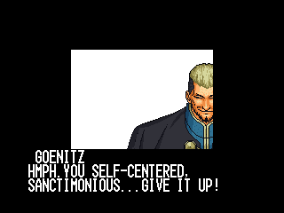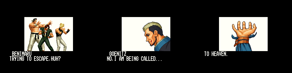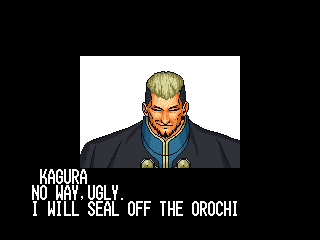 Goenitz can't get enough of that alliteration | Daimon makes some mad rhymes | Goenitz certainly isn't PC! | Kyo comments on Benimaru's effeminity | Uh, aren't bad people supposed to go to hell? | Somebody needs some Viagra! | Not only are villains not PC, but Kyo isn't either! | Yeah, well, I am rubber you are glue!