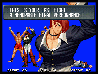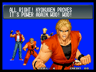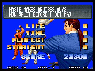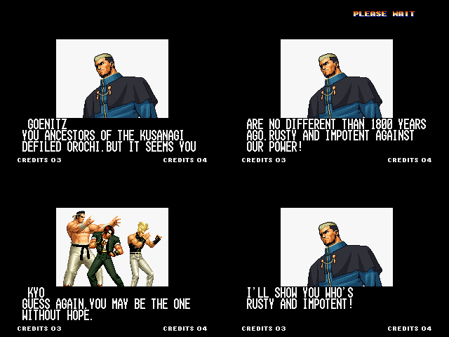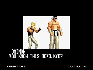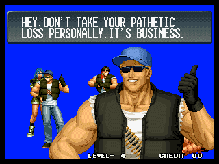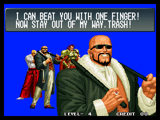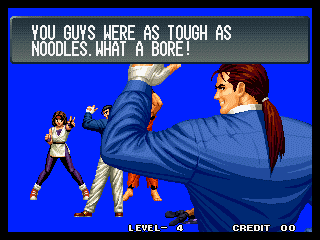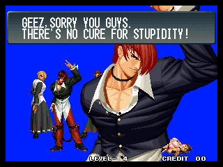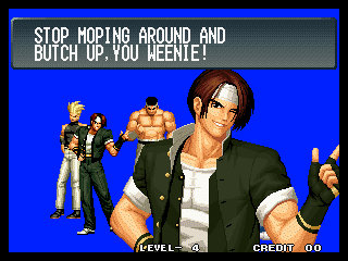 Robert... Robert... I want to kick you in the teeth, you mental midget... Ryo lays the hurt down From the last battles: Goenitz can't get enough of that alliteration | Daimon makes some mad rhymes | Goenitz certainly isn't PC! | Kyo comments on Benimaru's effeminity | Uh, aren't bad people supposed to go to hell? | Somebody needs some Viagra! | Not only are villains not PC, but Kyo isn't either! | Yeah, well, I am rubber you are glue! Old people are supposed to be wise, but you wouldn't think that from this lovely analogy | ...Well, last fight until the next KoF increment, at least... | Joe has got the MAD wit