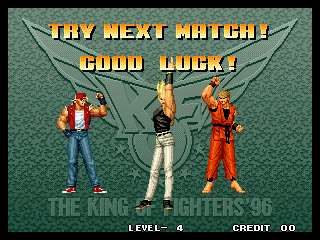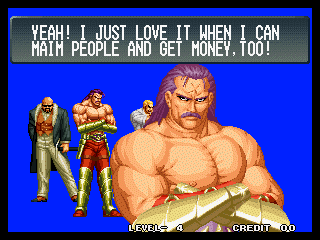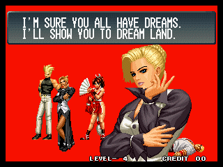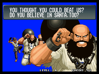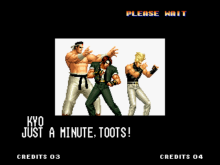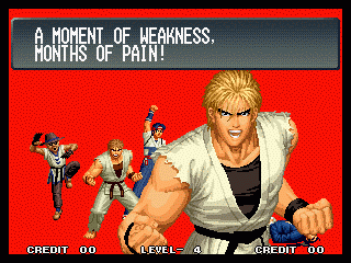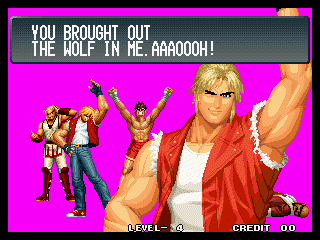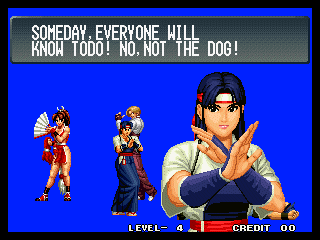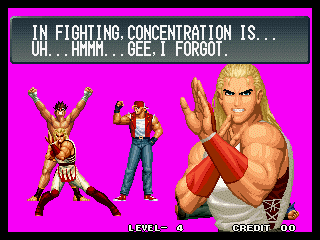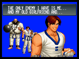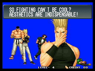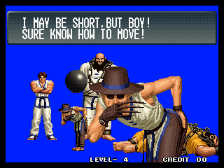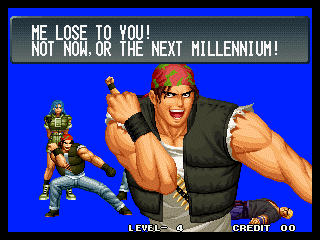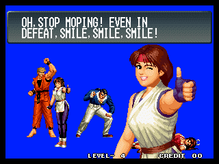 Kyo smashes your self esteem | Iori tells it like it is | Mature is in kahoots with Kirby | Absent-minded Andy | Ha ha! Just wait until the Y2K bug hits your computer! | Choi's favorite pickup line | Hey, I've eaten some tough noodles! You should try some of my Kraft Dinner! | I feel for ya, Kim | Kaiser's sure got the right idea! | Well, you're fat enough to be Santa... | Thanks Yuri! I feel an urge to do something useful! | "Someday, everyone will know Todo! No, not the dog!" | Ryo does his train impression | Then why do you use nightsticks? | "Try next match!" | Uhhh, yeah | Well gee, for a businessman you sure are unprofessional about it! | "You brought out the wolf in me. AAAOOOH!
