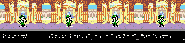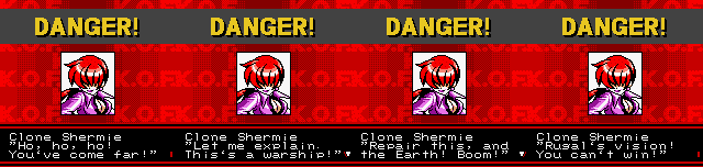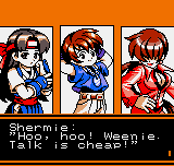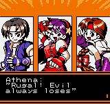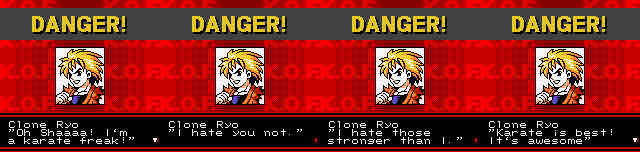 Fight (insert character name here)! For everlasting peace! | What's the power? Where is Rugal? Tune in next week! | Uh oh, the market of... PURE EVIL! | Who is the REAL hero? | You sound like a self-help book! | That's right! He'll beat the shit out of him even if he just wants to buy some fresh fish! | Um, it seems clone Ryo has defective intellignce genes. Even more so than the real Ryo... | What the fuck is he talking about?!? | Man, this game's English just gets worse and worse... | Oh no, I'm cannon fodder! | Go Go Next Zone! | Looks like he's running towards Rugal. And what's so evil about Rugal making a railway? | Yeah, stop those evil clones! | Oh no! Now we're fighting Lex Lugar? His crappy wrestling skills will kill us all! | Shermie makes very little sense, but at least she's wearing a reavealing outfit | The Ice Grave? Wasn't that from Final Fantasy IX? | The prelude to the stirring conclusion... | The stirring conclusion!