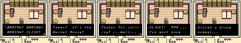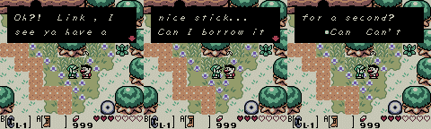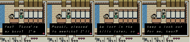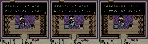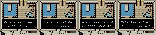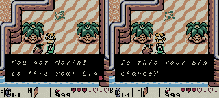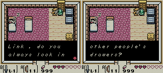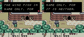 Unlike real RPG's where the main character can actually TAKE something from a dresser, Link gets mesmerized by just LOOKING at the damned thing, then forgets to loot it | Three common dog words of a dog's vocabulary: WOOF, Dig, and RUFF | Nothing turns Marin on like someone digging a hole.. | Haha, Link you pervert | Big chance for what? I got her already | I don't know what's funnier, the psycho alligator-man or the fact that the dialog goes third-person without any notice | HAPPY HAPPY! | This is Nintendo's subtle way of telling players to get a life | Okay, by this logic, anyone with the last name "McDonald" can walk into one of the restaurants and claim ownership | So the Wind Fish is neither wind nor fish.. uhh, good job naming the thing, Nintendo | Papahl is a real dope if he PLANS to get lost | Usually, people don't emphasize the L | Sexual innuendo? | So Link is "it" and the Witch is "we"... this witch has some definite pronoun problems
