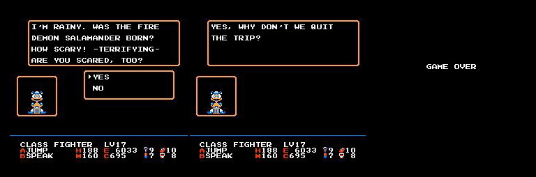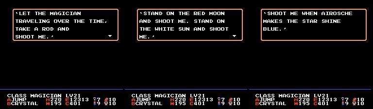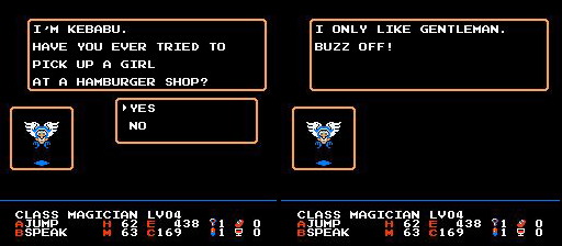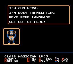 Umm, Arabian Class? | What about Larry and Moe? | Christ, can't these people mind their own business? He's a person, people! | Pure evil | This sounds like a Pokey the Penguin comic | Shot down! | Uh, what? | Nintendo censorship at its finest | Gee, thanks for the tip! Loser. | Really? Me too. | Jad raps! w0rd! | The last fellow? Damn. | Uhh, I don't believe him | Does it rain there? | I've never found losing large sums of money to be that refreshing | Why don't I just shoot you? Would that be alright? | Uh, what's a simitar? | Wuss. | I wouldn't allow a robot who speaks poor english to translate anything. Mind you, he probably translated this game. |
