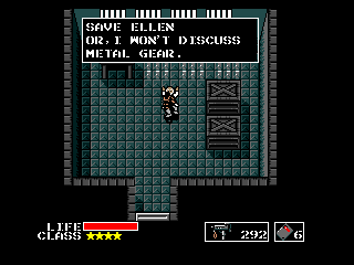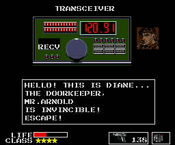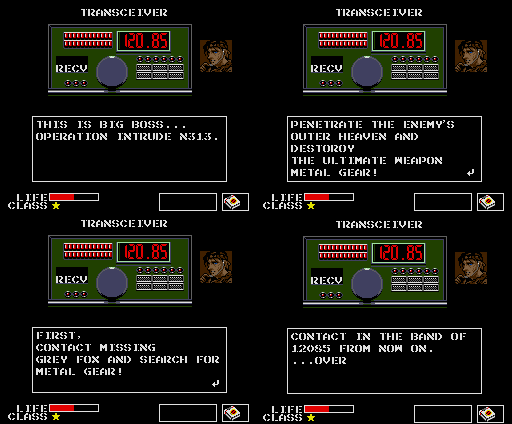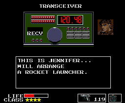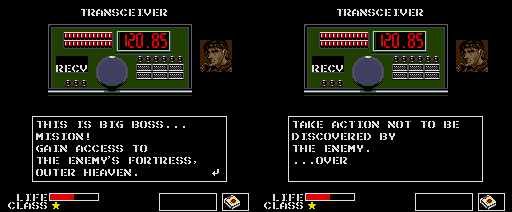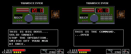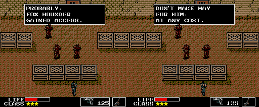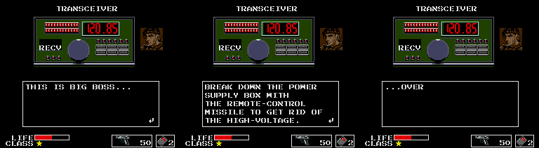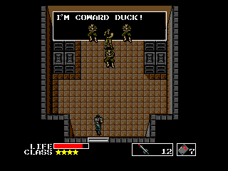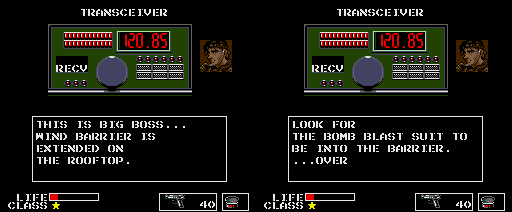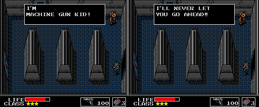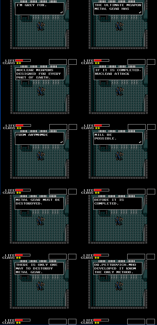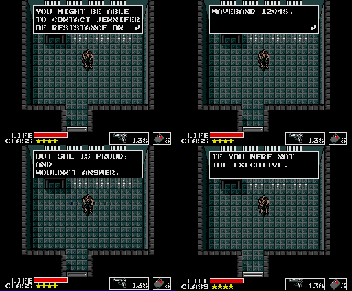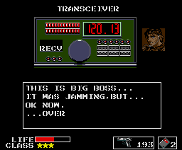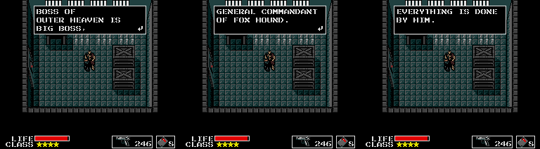 Big Boss was the reason Hitler came to power, I guess | Good for you, Snake, now you might consider some English lessons | An enlightened conversation between the guards. | ...What? | Grey Fox gives you the info | High voltage what? | Damn, and I needed to kill him to finish the game | We jammin' in the name of the lord | Snobby in the NES version, proud in the MSX version. One of the many differences | Yes, you goofed. Stupid. | Machine Gun Kid blocks your path. Good thing he's pretty dumb | It's a good thing I'm playing this on an emulator! Ha ha, stupid Big Boss | First flower arranging, now rocket launcher arranging | Shoot! It's Shoot Gunner! | I will, but only for you baby | Big Boss's bad english is a bigger hinderance than some stupid wind barrier.