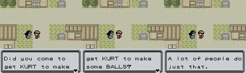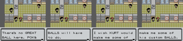 Oh come on. Like you didn't expect a Ball joke.. | ...or two! | Perverts everywhere! | Behold, the only Pokémon whose name just didn't quite fit.. | Cute and cuddly Pokémon, my ass | Whoa, hold on there, guy.. | You're a real saint | Keyword? What is this, AOL? | Only on weekends | Oh my god, it's... ANY STORE IN THE WORLD! | And how do you pronounce it? | Yes! Thank you! | A word you'll never hear outside of Pokémon: super-effective! | You sick little monkey! | Everytime I visit, I remember the smells of my youth | I'd agree if I knew what the hell he was talking about