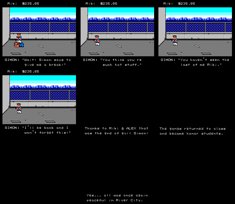 Boss Fun: But what defines a punk? | "I'm exhausted and all punched out." | Why the hell does he ask if you've given up when he's lying flat on the pavement? | "Hey dude, It's party time!" | Isn't it cute how they threaten you? | What's up with Turk and the word 'dude'?!? | What an ego. Referring to himself in the first person. | Especially when wussies like Clyde want a rematch. | Thanks for telling us in advance Ivan. | "You are worthy enemy. You may get lucky" | Beginners Ebonics 101 - "Yo" | "Howdy! I can't believe y'all got this far! | "You win, but the Twins will fix your wagon," | "If you plan to learn, you must learn to plan." - One of my school agenda books. | "Yeah, you certainly kicked our tails."
