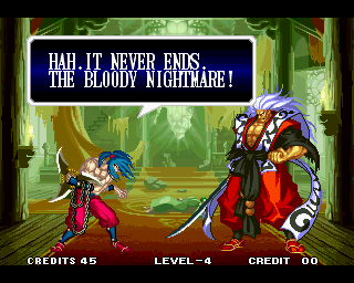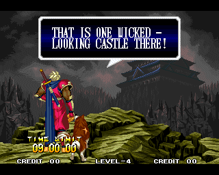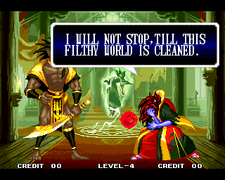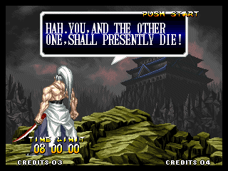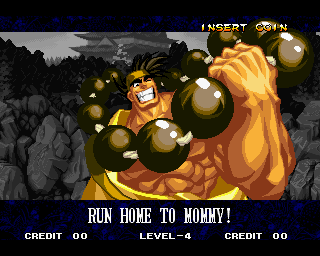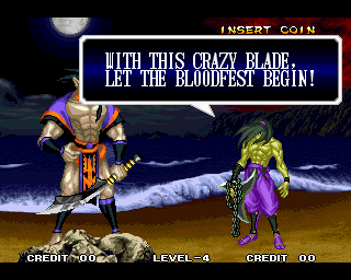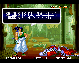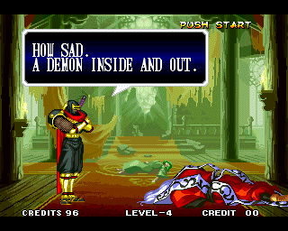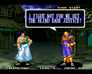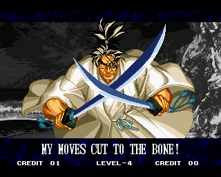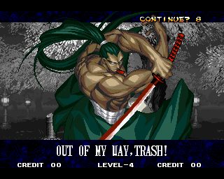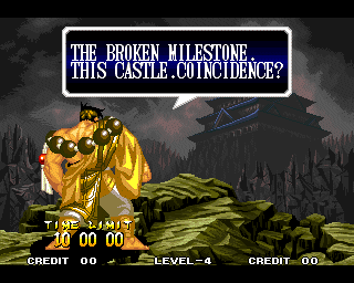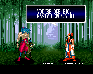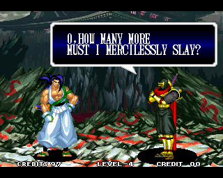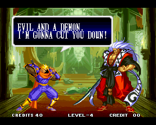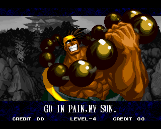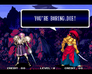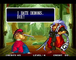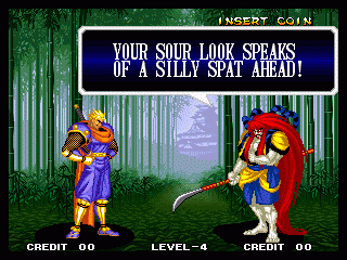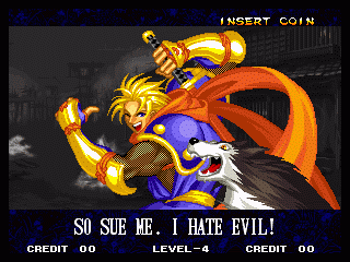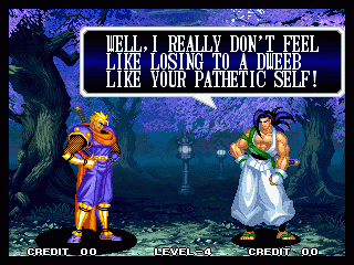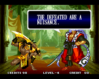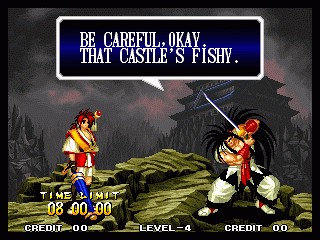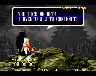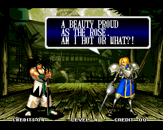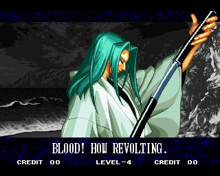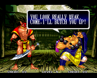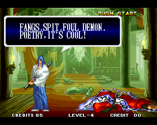 And I thought the NWO was going to be all ATF agents, Jews, and Roswell aliens! This just blows everything | Tam Tam's astounding grasp on the English language | More Tam-Tam English | Tam-Tam delivers a haunting epitaph | Yeah. He's dead | Why did they put a comma there? | Yes. There's a HOUSE! On a MOUNTAIN! WOW! | "What a show of demon strength. A virtual god!" | Good spelling | Yes, Haohmaru is addressing a house | Note how this is neither a regular nor a hypothetical question | "...Hmm, a presence I don't need... | Woah, getting a little excited there | "That is one wicked-looking castle there" | Is the evil like the justice? | Where does the "Ahhh" come from? | Yeah, with the dead bodies lying around messing up the place | Ukyo tries to be a poet | Ukyo tries more poetry. He sucks. | Woah. She's really shaken up. | Uh, what? | Um, I thought only the good and enlightened reached Nirvana | Haohmaru's a little dense | Charlotte gets right to the point. | That's why he's a demon, stupid | "O" is only used in apostrophe, retard. That means that you ADDRESS SOMETHING. | Any relation to Doctor? | Yeah, it's craaaaaazy! | He's really a little overdramatic | He's got a problem with sentence fragments | Oh baby | I thought she had regular teeth? | Ooh. Witty. | If she would just remove that comma... | Well, uh, so's your mom! | I don't want to know how he plans on doing that | He must subscribe to some weird religion... | Well, uh... So's your mom! | The religious equivalent to "Suck it, fatty" | Gaira's a pretty mean priest | The blind babe The Justice? | Galford is rad, dude! | The order of this sentence is really weird | What is he, some kind of hippie? | OH GOD, no... | Yeah, I know, you see good demons all the time | Short, and to the point. | Genjuro's a bully | This quote is another one of those awesome SNK insults. | At least Genjuro is decently poetic, *cough*UKYO*cough*AMAKUSA* | I think Genjuro's one of those goth vampire kids. "Blah! I want to drink your blood!" | Trash? NO! | Somehow, I think Genjuro likes the word "Die" | WHAT THE BLOODY FUCK !? Hanzo can't even get his apostrophes correct! | Then why not do it NON-mercilessly? Just for a change of pace. | Yo, I'll chill alright. Ice, Ice, Baby | Huh huh huh... He said... | What the hell is a "Plebe"? | Haohmaru's pretty hip. | I don't know how you could get the two mixed up | Who else is he talking to? | Uh, yeah, most moves with swords do | This brings pornography to mind... | Uh, a cross-dressing, demon-possessed psychopath is not a "gentle traveller". | Uh, that dude is twice Sogetsu's size | I thought it meant joyful happiness | GET THE HECK OUT OF HERE, YOU NERD! | Tam-Tam explains his purpose in amazing detail | Really... | Tam Tam busts some mad rhymes | What... the... fuck? | Yeah, I know | What's that comma doing there? | Okay buddy, you can have it if you want it! | Well, I guess he should just give up then with all that against him | THE SUSPENSE! | Then don't stab people! STUPID! | Like, whatever | You do? YAY!