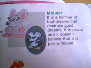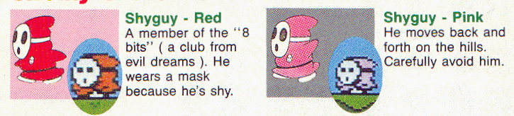 Mouser, the mad bomber with an identity crisis More manual scans from Yamcha Hibiki. Ninji (by the way, by strange, they mean "FUCKING PSYCHO" | Snifit | I never understood why they call them Shy Guys. Like, they're supposed to be shy or something, but why the hell are they trying to kill you? And your club sucks, Red Shy Guy. | Proof that whoever wrote this manual is a retarded kid | More proof |
