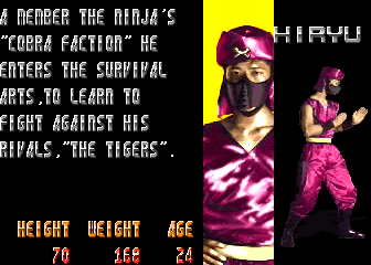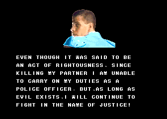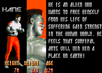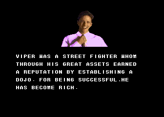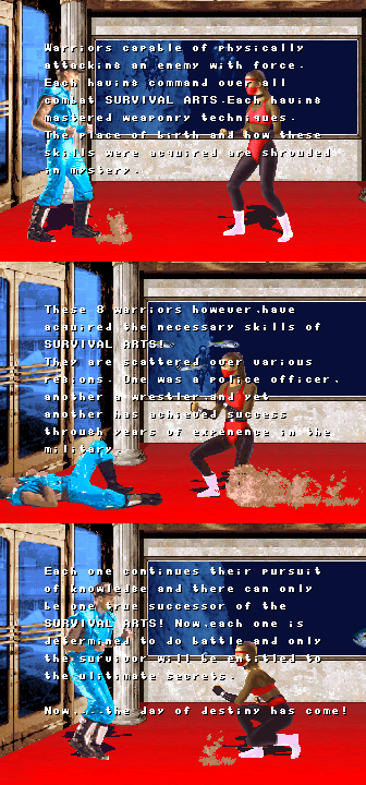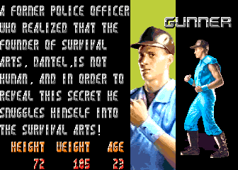 So the first prize in the Survival Arts tournament is Dantel's prized collection of human flesh? | He's got a purple shirt, he runs his own dojo, he looks like a dickhead...hey look, it's Dan! | In these turbulent times, THE JUSTICE needs everyone it can get - even Gunner | How could someone like Mongo even be allowed to appear in a fighting game, let alone beat the final boss and win? KNOW ONE KNOWS | "She now faxed day after day of endless emptiness..." - maybe she got an office job or something | I have to admit, this one made me cry... | This ending would actually be quite nice, if Kane wasn't trying to crush the kids' heads with his hands | THE JUSTICE has another new recruit!