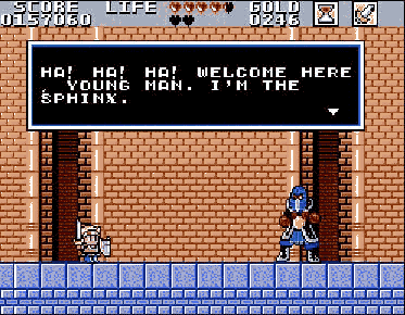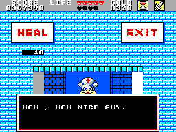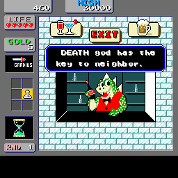 Hey, Wonderboy uses the same currency as in Faxanadu! "DEATH god has the key to neighbor" "Knights occupy my hamlet above cliff" What the hell kind of quiz is this?! And from the Master System version No one can resist a person with the power of DESTRUCITY! | Yes, I'm quite a nice guy. Unlike Young Nasty Man, arch-rival and nemesis to Wonder Boy! |